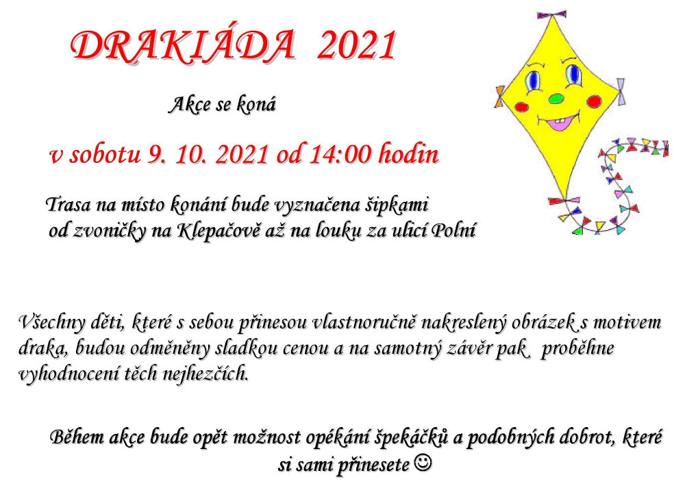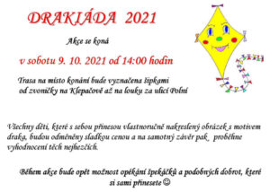 Drakiáda 2021 8.10.202121.9.2021 autor: Administrátor Zveme vás na Drakiádu, která se koná v sobotu 9. října 2021 od 14:00 hodin. Více informací na plakátku.